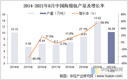 Titanium sponge is the main upstream raw material of titanium alloys. After the changes in the period from 2014 to 2015, the output of titanium sponge in my country has dropped sharply. The output in 2015 was 54785 tons, a year-on-year decrease of 46.02%. With the broadening of high-end titanium alloy applications, 2015 -In 2019, my country's titanium sponge production continued to grow, from 54,800 tons to 88,100 tons, with a compound annual growth rate of 12.61%. The industry continued to recover in 2020, and the production of sponge titanium reached 138,200 tons, an increase of 56.9% year-on-year. The output from January to August in 2021 is 102,900 tons.