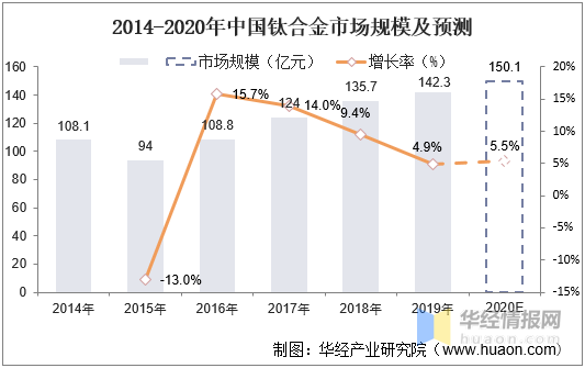 From 2014 to 2015, affected by the adjustment of my country's national economic structure, the output of titanium sponge in the upstream declined rapidly and the demand for titanium alloys in traditional industrial fields such as downstream traditional chemical industry and metallurgy declined, resulting in a decline in the output value of titanium alloys and accompanying the adjustment of my country's industrial structure. Initial results have been achieved. High-end titanium alloy applications such as aerospace and marine engineering have achieved rapid development. After 2015, the output value of titanium alloys has increased steadily. From 2014 to 2019, the market size of my country's titanium alloy industry increased from 10.81 billion yuan to 14.23 billion yuan, with a compound annual growth rate of 7.11%. In the context of the continuous adjustment and upgrading of my country's industrial structure, the market for high-end titanium alloys is huge, and the demand for high-end titanium alloys with high added value will steadily increase. It is expected that the market size of my country's titanium alloy industry will exceed 15 billion yuan in 2020.