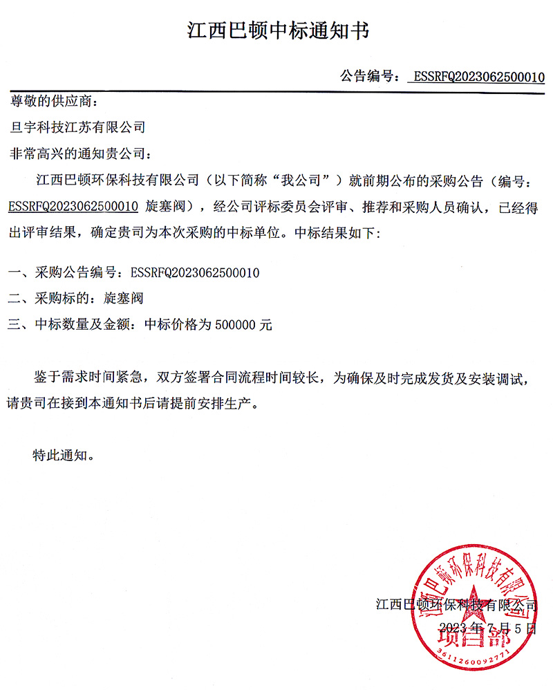 苛刻工況鈦材旋塞閥中標(biāo)函(江西巴頓)
