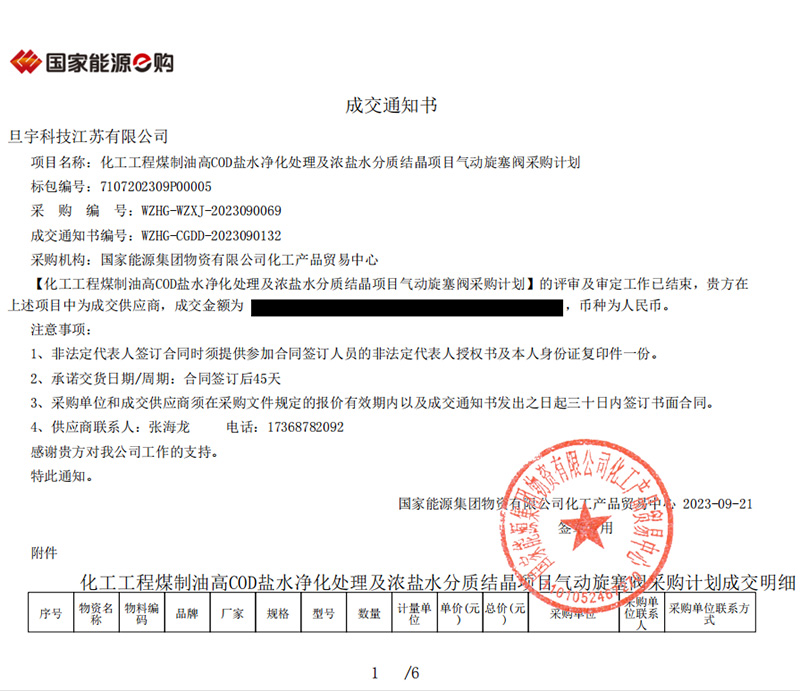 國(guó)家能源集團(tuán)化工工程煤制油高COD鹽水凈化處理及濃鹽水分質(zhì)結(jié)晶項(xiàng)目氣動(dòng)旋塞閥采購(gòu)成交通知書
